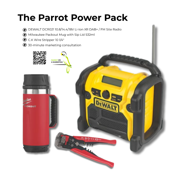 In this month’s competition, readers have the chance to win the Parrot Power Pack – a special bundle of prizes comprising a DEWALT DAB+ / FM site radio, a Milwaukee Packout Mug, a C.K Wire Stripper, and a 30-minute marketing consultation with the team at Parrot.
